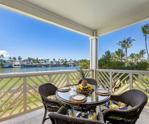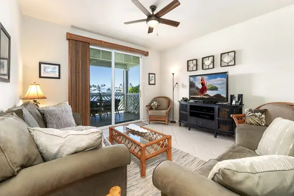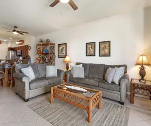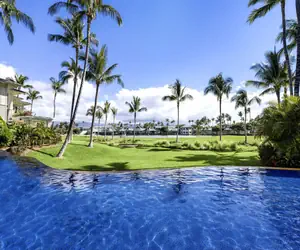 Kitchen features deluxe appliances, granite counters, and is fully equipped with all cookware, dishes, utensils, Cuisinart, Keurig coffee makers, and electric tea kettle; it really has everything you’ll need. The spacious lanai overlooking the Kings’ Lake and shops is the perfect place to start and end your day…coffee in the morning while you watch golfers from the 4th tee of the Beach Course. Or evening cocktails, take in a sunset, and gaze at the shimmering lights reflecting off the Kings Lake. Relax and enjoy the living area which features a 50” flat screen High Definition TV, Blu-Ray DVD, FREE Wi-Fi, iPod dock, ceiling fans, BRAND NEW A/C SYSTEM, washer/dryer. One of the best locations in the entire Waikoloa Beach Resort area and Fairway Villas complex. Convenient, yet quiet and tranquil. Stroll to the infinity edge pool and hot tub. Or the open-air fitness center which provides aerobic & weight equipment. Also, pool-side gas barbeque/grilling area with plenty of BBQs. FREE PARKING.