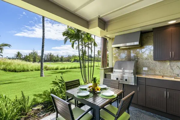 When you’re ready to simply relax at your vacation home, you will enjoy a fully outfitted kitchen with granite countertops and stainless-steel appliances. A dishwasher, microwave, blender, rice cooker, toaster and a pancake gridle are all standing by for your use. Want to flame-grill? There is a private outdoor kitchen right on your lanai with a table & chairs, a sink and a Viking gas grill. Watch the golfers while you enjoy a little dining alfresco. The Waikoloa Beach Villas property is attractively covered in manicured lawns, tropical gardens and palm trees. There are two gated, heated pools – each with chaise lounge chairs, sun umbrellas and a hot tub. One pool is directly across a private road to this unit. The other pool area includes a fitness room.