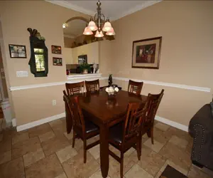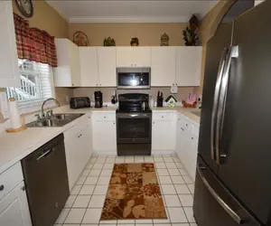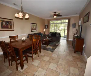 This first floor villa has been professionally decorated with both families and golfers in mind. The spacious great room contains an entertainment center with large screen TV and a DVD player, and open to the fully equipped gourmet kitchen. The great room looks out to the screened porch with views of the 4th tee box of the Greg Norman Course.