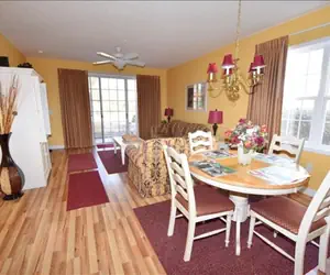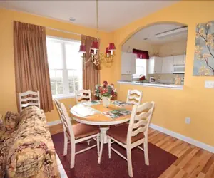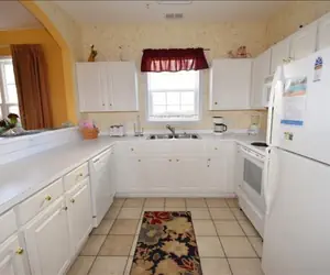 The gathering room offers ample seating room for everyone in your group, featuring a handsome sofa and loveseat. The entertainment center hosts a flat screen television and a DVD player, so bring along some DVD’s and enjoy! You can keep in touch while you enjoy your vacation because this villa has wireless Internet. The screened porch is just off the living area, and overlooks a beautiful backyard for outdoor games. The adjoining dining room is lovely and seats four comfortably. The bright and cheerful kitchen is well stocked with housewares and everything you need to prepare a gourmet meal.