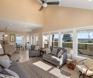 This beachside vacation home in the Emerald Beach 2 Subdivision is a relaxing getaway with spacious deck space! A crisp white interior with pale accents keep this retreat light and “beachy” feeling. High ceilings and a wall of windows in the living room make it the perfect place to enjoy the company of your friends and family while relaxing into the pace of peninsula life. Sleeping accommodations include a room with a double/twin bunk bed with a twin pull out, a room with a queen and twin bunk bed, and the king sized master. The master suite features a private balcony with spectacular views of the Gulf. Ready for some time outdoors? Sunbathe on the deck or head down the neighborhood road past two houses to the beach access for sand and surf!