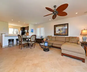 This space has 2 bedrooms and 2 bathrooms. Both bedrooms feature comfy king-size beds, making it perfect for 2 couples or a family of 4. The condo is located on the ground floor, with a few steps down into the entrance. Both bathrooms have double vanity sinks and tiled walk-in showers.