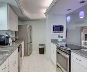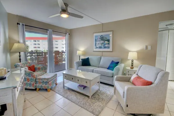 • As you step inside, you'll be greeted by a warm and inviting ambiance, highlighted by beautiful Gulf and courtyard views. The spacious living area features a cozy seating arrangement, perfect for unwinding after a day of adventure. The well-equipped kitchen boasts modern appliances, including a refrigerator, microwave, dishwasher, and coffee maker, ensuring you have everything you need to prepare delicious meals.