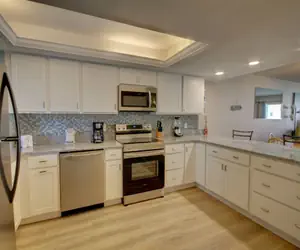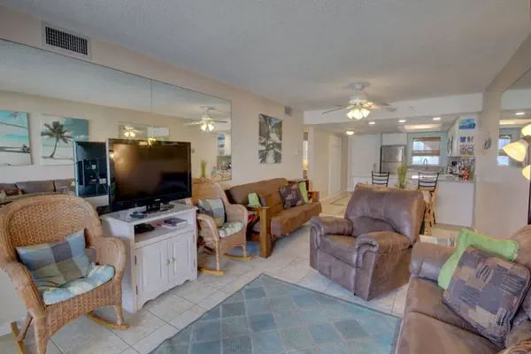 Great views from this lovely 2 BR / 2BA unit. This unit has a completely renovated, fully furnished kitchen that has everything you need to enjoy a great meal. Living room has tremendous views of the Gulf of Mexico and the large gulf front pool. All new flooring throughout the unit. There is also a great view from the master bedroom which has a king size bed. The guest bedroom has two twin size beds. Relax on your balcony while you listen to the waves hit the shore and watch dolphins swim in the Gulf of Mexico.