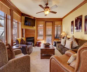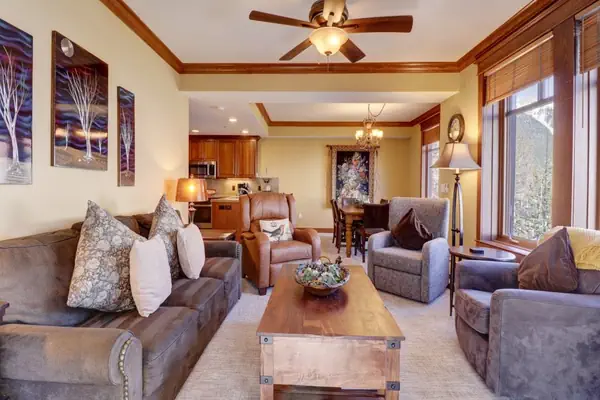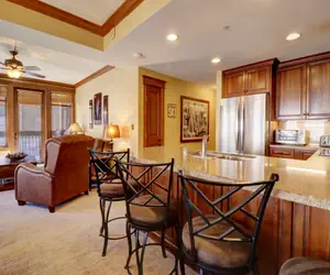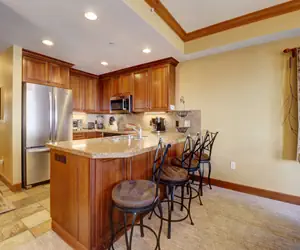 High end, platinum rated, 3-bedroom/3 bathroom condo located smack dab in the middle of Center Village. This totally remodeled condo is on the second floor and is on the corner of the building. It sleeps up to 9 people and boasts spectacular views of Burning Stones Plaza, American Eagle Lift, and the Halfpipe! You can't beat this location Make yourself at home in the spacious and comfortable living room on the American Leather sofa. This couch does have a Queen Sleeper Sofa that will sleep 2 adults comfortably without the traditional bar across your back. Catch the big game on the 47 inch flat screen TV, or watch a DVD. The well appointed kitchen is perfect for cooking all of your meals at home, and it features new cabinets, granite counters and back splash, stainless steel appliances (including a convection oven and glass cook top), and slate floors. Serve your family of 8 people at the dining room table, and there are 4 additional seats at the breakfast bar.