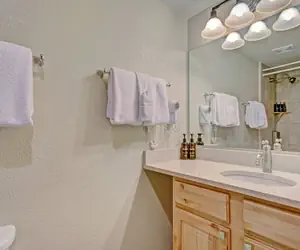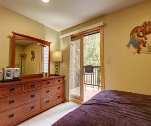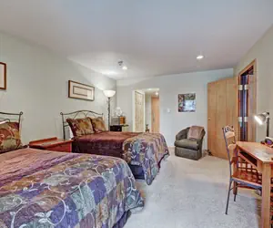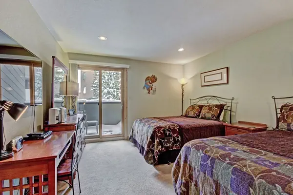 This fantastic second floor, ski-in/ski-out hotel room sleeps up to 4 people. It is easy to catch the first chair! Ski down to the base of the American Eagle Lift or the Green Acres learning area. Enjoy stunning views of towering lodge pole pine trees and Center Village from your private balcony. There are 2 Queen Beds, a TV, mini fridge, microwave, coffee maker, and a private balcony. There is a separate sink area and vanity just out side of the bathroom for extra space to get ready.