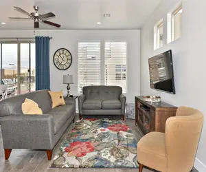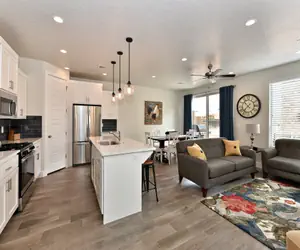 Snow Canyon Escape is an 1812 sq. foot, 3-bedroom, 2.5-bath luxury villa furnished with all the upgrades you could ask for, including 5 Smart HDTVs, granite countertops, and stainless steel appliances. The spacious floor plan features quiet and private bedrooms, providing a comfortable retreat. Whether you're seeking relaxation or exploring the surrounding landscapes, you can unwind in the contemporary-style bedrooms, on the partially covered outdoor patio, or spend quality time with family and friends in one of the two family/recreation rooms.