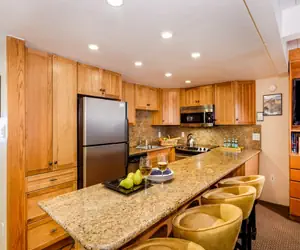 Continue down the hall to the open-concept living and dining area, where you can relax by the wood-burning fireplace or step out onto the private patio. The patio is furnished with a grill and Adirondack chairs, perfect for enjoying Aspen’s fresh mountain air. The living room also includes a pull-out sofa and access to a third bathroom, providing flexible sleeping arrangements. The dining area comfortably seats three, with four additional seats at the breakfast bar.