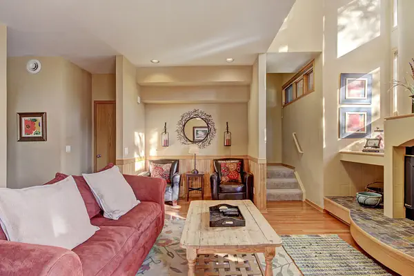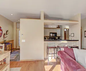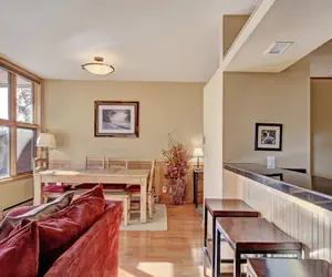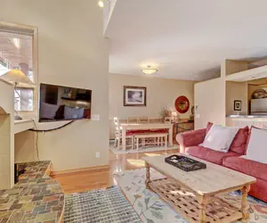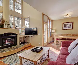 This unique three bedroom townhome is the perfect option for a family retreat to Keystone Resort! It is extremely close to the resorts best activities; like hiking, mountain biking and of course skiing! Guests of Soda Springs II also have access to an outdoor heated pool and hot tub. Situated on two floors, at nearly 1,500 square feet with a raised first level, this townhome feels like it's nestled in the trees and has a lovely ambiance. The main living area features a two story gas fireplace with a large hearth, a cozy seating area with a flat screen tv, vaulted ceilings, and large floor to ceiling windows. The dining area is just off the living room and has seating for up to seven guests with additional seating for three at the bar. The updated kitchen with a pass through to the living room makes entertaining and serving meals a breeze. Step out onto the private balcony and enjoy the fresh mountain air. There is also a stacked laundry unit in this townhome for your convenience.