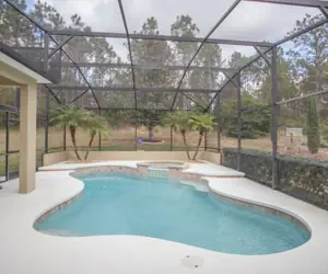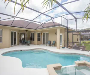 There are two twin beds with a full bathroom situated between the two bedrooms. There is also a queen bedroom with the pool bath next to it. The pool bathroom has a large walk-in shower, toilet, and hand basin, with a door leading to the pool deck.