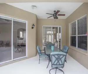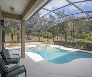 Out on the pool deck, there are loungers by the pool and a patio table and chairs.