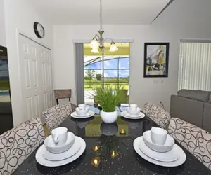 This spacious 6-bedroom holiday villa can comfortably accommodate a larger family or group of up to 12 people. The home features 6 bedrooms, 5.5 baths, a fully equipped kitchen, a large private outdoor pool, a patio with outdoor furniture and a covered lanai, a game room with a pool table, ping pong, and foosball, a full-size washer/dryer, a dishwasher, central air, towels and bed linens, internet access with WIFI, a telephone with free local calls, a 60" flat-screen TV in the living room, and flat-screen TVs in all 6 bedrooms. The villa has a total of 2826 square feet and the pool is facing south. The lead guest will need to provide a complete guest count to access the community and clubhouse.