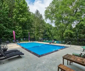 Experience relaxation and recreation as you step outside into a serene hillside yard surrounded by towering trees and lush greenery and take in the breathtaking views of the surrounding woods. This outdoor space is packed with amenities to keep you entertained and comfortable. Unwind in the hot tub, perfectly positioned for taking in the stunning vistas, or fire up the gas grill for a BBQ feast. Take advantage of access to the nearby clubhouse with recreational facilities, including tennis courts, where you can challenge friends and family to a friendly match. And when you need to cool off on a warm summer day, swim laps in the community pool or simply lounge by the water's edge. We've also got a fun-filled playground area for younger travelers, complete with equipment for kids of all ages to enjoy. When it's time to put your feet up, take in the peaceful sounds of nature and enjoy the serene atmosphere of our hillside retreat.