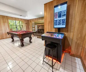 - This game room is a fun and lively space designed to bring out the kid in everyone. The room has a full-size pool table, perfect for friendly competitions and laughs with friends and family. A Ping Pong Table is also set up for quick pick-up games or tournaments, and an Arcade Game Table provides hours of entertainment for all ages. This spacious room also has a twin bed and futon bed for additional guests at bedtime. Additional chairs allow extra seating for everyone to spread out and have fun without feeling cramped. A table and chairs are perfect for family game nights. A sitting area around the corner has a comfy sofa bed, armchair, and flat-screen TV for additional entertainment options. This game room is the perfect spot to make memories and have fun!
