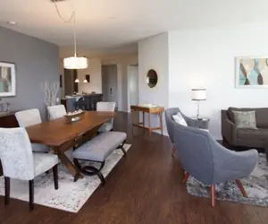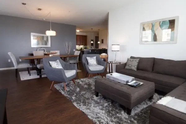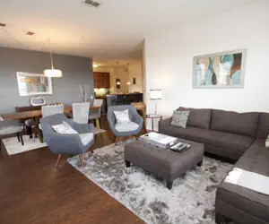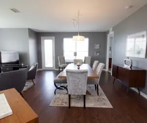 Our spacious open-plan living area is lavishly furnished with a point of view. A 60” Smart TV and a large dining table with seating for 8 which can also double as a conference table.