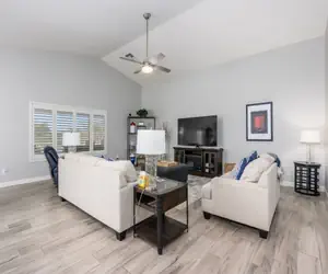 3 bedrooms and 2 full baths overlooking the 2nd hole of the Dove Valley Ranch Golf Course; facing west for AMAZING sunsets! Enjoy your sunset cocktails around the fire-table out back or while dipping in the pool. You will also find a large TV on the patio to watch from the pool or lounge chairs! This home is all on one level, with no stairs. The GREAT room boasts new porcelain wood-grain tile, modern cabinets and quartz counter-tops. The master bedroom offers a king bed, large flat screen TV, attached master bath and walk-in closet along with a slider to access the backyard and views. The 2nd guest bedroom offers a queen bed and a television. The 3rd guest bedroom can be used as an office with television or the Murphy bed can easily be pulled down which offers a real queen mattress. Additional sleeping arrangements can be made on the queen sleeper sofa in the living room.