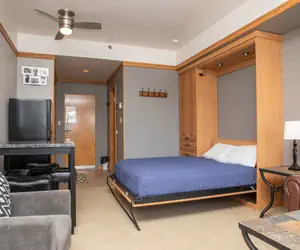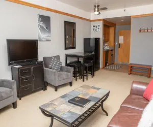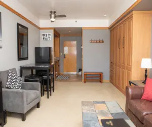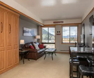 Enter into the main living area and you will be pleased with the abundance of space and light in this studio due to the queen Murphy bed which can be folded up or down. While the bed is up, you have plenty of space for activities. While it's down, enjoy the comfort a normal bed and get a much needed great night's sleep after a long day of skiing. The couch and arm chairs are just past the Murphy bed, which allow you to relax in front of the TV. However, put away those TV dinners, you can enjoy the luxury of a full sized dining table for your home-cooked meals. It'll be like you never left your own home. There is also a queen sleeper sofa to accommodate additional guests.
