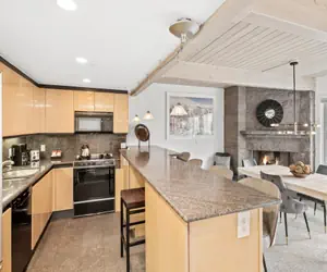 The living room features a gas fireplace, comfortable seating, a dining table, and a flat-screen TV—perfect for relaxing after a day on the slopes. The fully equipped kitchen provides everything needed to prepare a gourmet meal for family or friends.