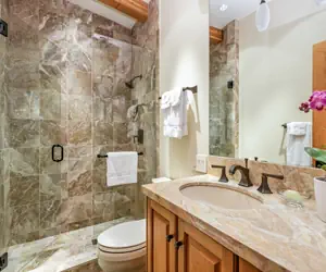 The primary bedroom features a king bed and a private balcony with stunning views of Smuggler Mountain. Its ensuite bathroom includes a spacious walk-in shower. The guest bedroom offers two twin beds, which can be converted into a king upon request, and convenient access to an additional full bathroom.