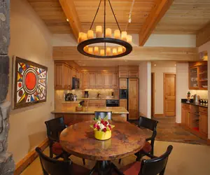 The living room opens to another balcony overlooking Aspen Mountain—ideal for relaxing with morning coffee or après-ski cocktails. The kitchen is fully equipped with everything needed to prepare a gourmet meal, which can be enjoyed at the inviting dining table while taking in the mountain views.