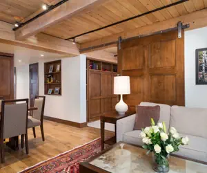 The living area features beautiful wood flooring, a sectional sofa with chaise, a wood-burning fireplace, custom built-ins with a flat-screen TV, and a seamless flow into the kitchen, creating an inviting space for relaxation and entertaining. A large barn door opens to the den, which includes lounge seating and a hidden Murphy bed, providing a private sleeping area for additional guests.