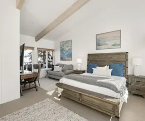 On the upper level, the open living and dining area offers a cozy fireplace, comfortable seating, and a bar with seating for four—perfect for gathering after a day on the slopes. Balconies on both sides of the condo provide lovely outdoor spaces to take in the fresh mountain air. The master bedroom is located just off the living area and features a spacious layout with a king bed and an ensuite bathroom.
