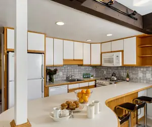 The kitchen opens seamlessly into the living room, where guests can relax in the comfortable seating area around the wood-burning fireplace. Off the living area, a den space features a dining table and a sleeper sofa, providing additional flexibility for guests. The condo also includes a washer and dryer for added convenience.