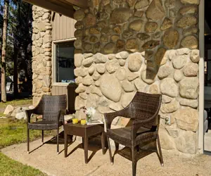 Step outside to the private patio, where you can enjoy the fresh mountain air and the surrounding grassy area, ideal for relaxing after a day of adventure.
