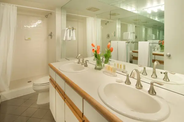 Spanning 1,130 square feet, the condo features a thoughtful layout with a bedroom on each side of the entryway. The primary bedroom includes a king bed and a private ensuite bathroom, while the guest bedroom offers two twin beds that can be converted into a king upon request, with access to a second bathroom off the hallway—perfect for families or groups.
