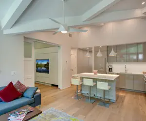The primary bedroom features a king bed and a private ensuite bathroom, while the guest bedroom offers two twin beds, which can be converted to a king upon request, and easy access to a second bath. The fully equipped kitchen includes a high-top dining table and bar seating for four, seamlessly opening into the living area, where guests can relax by the fireplace after a day outdoors.