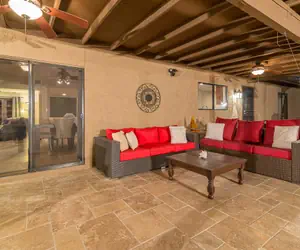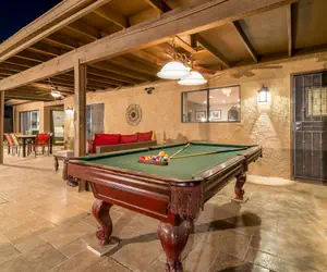 Plenty of indoor and outdoor entertaining space include a family room with HUGE flat screen TV, DVD player. The living room opens to the dining area, breakfast bar and fully stocked kitchen. An additional sitting area off the living area provided as well. The glass sliding doors open to the large outdoor covered patio with plenty of seating to relax. Enjoy the stainless steel BBQ, outdoor pool table, putting/chipping green, "Tiki Toss" game, hot tub and HEATED*** (additional Charge) diving pool! (Please note the actual diving board has been removed for safety reasons, but the pool is deep enough to dive in). So much to do! Turn on the misting system and the ceiling fans which cools the patio a good 10 degrees or so in the heat of the summer. Perfect for a relaxing get-away, golf trip or your next family reunion! You will also find 4 chaise lounge chairs to sun-bathe, along with an outdoor dining table. Extras such as board games and books will keep you entertained for days.