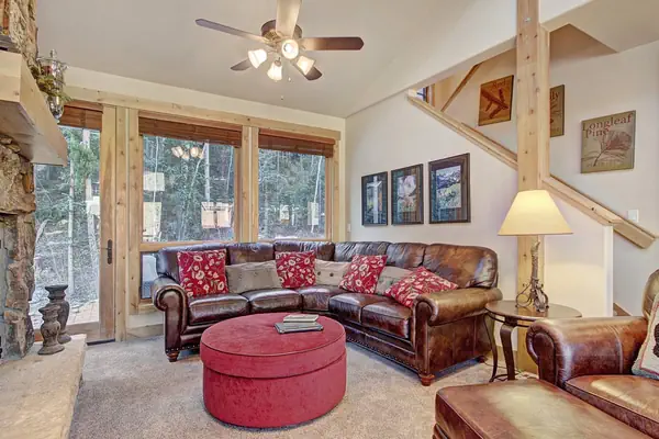 On the second floor is the main living area. The kitchen features updated stainless steel appliances, a wine chiller and granite countertops which the family chef will appreciate! There's a nice breakfast bar with two swivel chairs and the dining table seats 8 and is perched in front of huge windows that bring the outside in. Vaulted ceilings, a sectional leather couch and a stone wrapped fireplace adorn the living room. The back patio is just off the main living space and ground level. This patio is also a great entertaining space with four comfy swivel chairs.