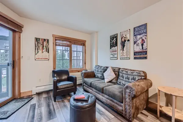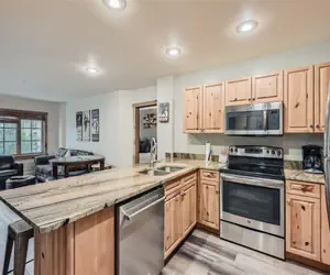 This charming 2 bedroom condo is the perfect retreat your family has been looking for! Conveniently located in River Run Village, you can walk to the slopes in a brisk 2 minutes or enjoy the many nearby shops and dining options! When you enter the condo you'll understand what sets this one apart from the rest! The lovely kitchen has been updated with stainless steel appliances and an oversized stone slab countertop, perfect for eating, enjoying a beverage or playing games! There is seating for up to six guests at the bar-counter, and this efficient use of space allows for more room to relax in the living room. Freshly updated living room furniture, a flat screen TV, and a stone-wrapped gas fireplace adorn the living room. Just off the living room is the square facing patio with 2 chairs and views of the nearby slopes. This patio is perfect for sipping hot coco, watching the snow fall and viewing the ice skaters in the rink below!