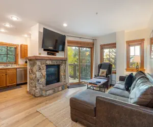 Expedition Station is an amenity rich building. Inside on the the lobby level you’ll find a massive, beautiful stone fireplace setting with cozy seating arrangements. There is an adjacent entertainment alcove with large wall-mounted, flat-screen TV and a handsomely rugged billiards table for all to enjoy. Rejuvenate in the year-round outdoor heated swimming pool and hot tub just outside the main lobby. Steps down the hall you’ll have key-card access to a plentiful exercise room, with weight and cardio machines, as well as the adjacent steam room. You’ll also have a private ski-locker just steps from the front door of the building and a heated, underground parking garage. Directly out the front doors of Expedition Station is Dercum Square’s quaint outdoor skating rink (mini-golf in the summer-time), and of course you’re just a 2-3 minute walk to all of the inner-village activities, shopping and dining of River Run Village and the River Run Gondola.