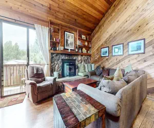 Located in the heart of town, and walking distance to everything, this spacious 3 bedroom plus loft, 4 bathroom townhouse has everything to offer. It features a 50" flatscreen TV and Roku Streaming/YouTube TV access, high-speed Internet access, private washer/dryer, and cozy pellet fireplace. You will enjoy a quiet forest setting from the balcony and there is plenty of space for everyone to spread out and relax throughout the cabin. The open kitchen is great for entertaining and is fully stocked with everything you need including an induction range and ceramic cookware, and enjoy a private BBQ grill. The master bedroom features a California King bed, flatscreen TV with Roku streaming/YouTube TV access and en-suite full bathroom with tub/shower combo. The second bedroom has a Queen bed, flatscreen TV with Roku streaming/YouTube TV access, desk with workstation if you need to work or school remotely, and en-suite fulll bathroom with tub-shower combo. While the third bedroom downstairs is perfect for the kids (or singles) and features two Twin beds, flatscreen TV with Roku/YouTube TV streaming access and en-suite bathroom. The loft upstairs has even more sleeping space with a Double bed as well as bunk bed with a Twin on the top and Double on the bottom, with access to the hall upstairs full bath with walk-in shower. An entry way mud area allows a space for all your adventure gear, and the home comes with boot dryers and glove warmers. The Mammoth Sierra Townhomes complex offers a swimming pool, two hot tubs, sauna, and laundry facilities with parking available right in front of the units. Mammoth Sierra Townhomes offers some of the best floorplans in town with plenty of bathrooms and convenience and is an ideal location for families. All guests receive complimentary full access to Snowcreek Athletic Club to enjoy facilities including indoor heated pool, steam/sauna, full fitness facility, yoga, pilates and cycle studio and more. This unit has 3 levels inside, is non-smoking. This condo sleeps a maximum of 9 people and comes with 2 outdoor parking spaces. Guests will be provided two parking passes. If more parking is required than what is allotted, feel free to call our office for alternative options. Our calendar is updated in real time. (Property Certification #: TOML-CPAN-13101) Unit Code= MST24