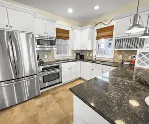 Inside, the home welcomes you through double French doors into an open-concept living area designed for easy gathering. The fully stocked kitchen features stainless steel appliances and granite countertops, making meal preparation simple for families and groups. The dining area comfortably seats six, and a full bathroom on the main level adds everyday convenience.