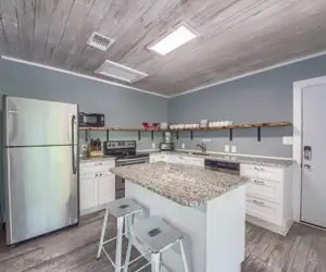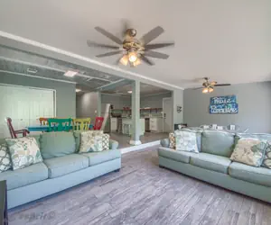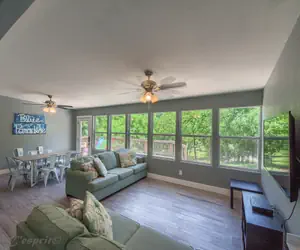 This blue beauty is a 1200 sq. ft. home with a deck in the front and covered porch and carport on the side sits on nearly an acre. The home is located between the 2nd and 3rd crossing. Blue Paradise accommodates 12 guests with three bedrooms and two bathrooms. Parking for 4 cars. If interested in popping up a tent in the yard or bringing an air mattress, 2-4 extra guests can be added to the reservation.