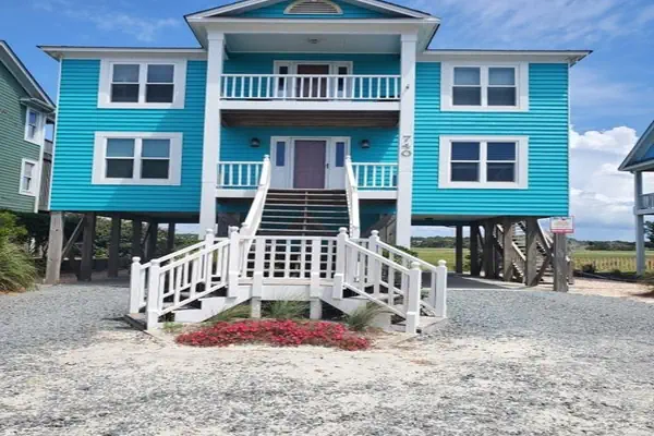 The home includes four bedrooms—one conveniently located on the main level—and three bathrooms, also with one on the main level. Additional amenities include TVs, expanded cable, WiFi, washer and dryer, and an enclosed outdoor shower with hot and cold water, perfect after a day at the beach.