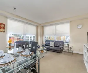 A stunning impeccably kept furnished apartment in a prime location within the City. Innovative design, spacious floors with full size kitchen and living area, washer and dryer, luxurious beddings, linens and furnishings in bedrooms and bathrooms. With FREE access to WiFi, Fitness Center, Indoor Pool, Sauna & Steam Rooms, and Jacuzzi and BBQ area. A perfect city oasis of comfort and luxury.