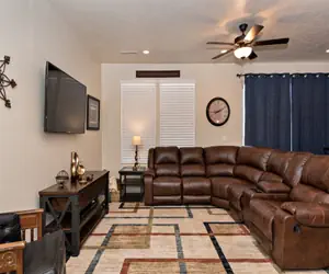 Lovell’s Loft comfortably accommodates 13 guests with 2 king-size beds, 1 queen-size bed, 2 full-size beds, and 3 twin-size beds. Three bedrooms feature en suite bathrooms for added privacy, and each bedroom is equipped with a smart TV, as well as DirecTV.