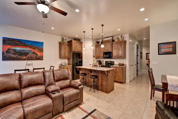 Welcome to Lovell’s Loft, a spacious 1,812 sq ft townhome boasting 4 bedrooms and 4.5 bathrooms, ideally situated just steps away from the 18th fairway of the Ledges Golf Course. The expansive layout features a well-appointed kitchen and two outdoor living spaces, ensuring everyone has room to relax and enjoy their surroundings. On the main level, you'll find the master bedroom and a fantastic kitchen stocked with cooking utensils for convenient dining in during your vacation. The living room offers a large TV with YouTube TV and DVD player for entertaining family nights. Step out onto the lower back patio, complete with a BBQ and outdoor dining area. Upstairs, the upper balcony provides additional outdoor space with a seating area and lounge chairs, offering one of the best views of Snow Canyon at any time of the day.