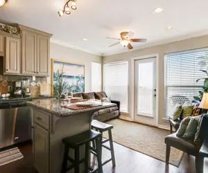 At night, this one-bedroom, one-bathroom unit can accommodate as many as six guests. The bedroom features a king-size platform bed and television. A double-size sofa bed in the living room provides additional sleeping space and the kids love the alcove in the hallway with the twin bunks built in.