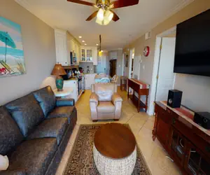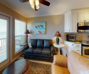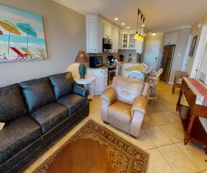 Living Area: The living room features stylish, upgraded furnishings, including a neutral-toned sofa bed with 7” mattress, cozy seating, and a large 50” TV with expanded cable package, perfect for relaxing after a day spent on the beach.