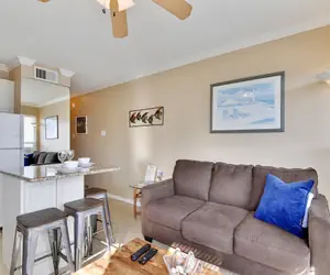 This third-floor unit (elevator accessible) features living/dining/kitchen area. The living area has a brand-new sleeper sofa, brand-new large flat screen television with cable for your convenience. The master bedroom has a queen bed and new large flat screen TV to enjoy, as well as a set of twin bunks built into the hall alcove with private storage as well.