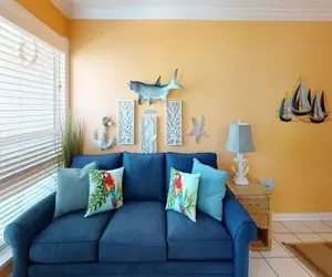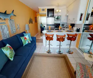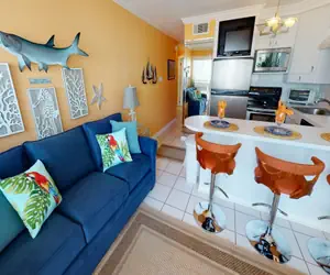 • Welcome to your perfect getaway! This bright and stylish poolside condo offers a cheerful retreat with a serene king bedroom, a fun aquatic-themed bathroom, and an open-concept kitchen with a breakfast bar for three. Relax in the sunlit living room or take a dip in the sparkling pool—your vacation starts here!