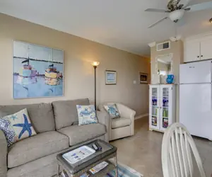 Step inside this cozy condo to find a an open concept that the whole family will love. Have a seat in the living room and watch the flat screen TV or access the WiFi to stay connected. A full kitchen features new stainless-steel appliances, plenty of space to maneuver, and all the cooking tools you may need to whip up tasty meals. Enjoy your meals at the provided dining table while enjoying the view of the gulf from the kitchen windows.