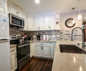 The custom kitchen has been upgraded with new cabinets, stainless steel appliances, stone countertops and tasteful pendant lighting, as well as a fully stocked kitchen with ALL of the essentials to prepare your meals.
