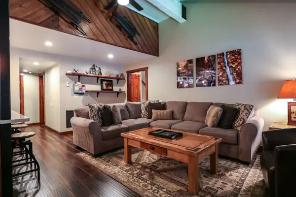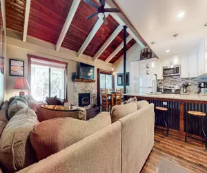 The living room has a large 55" TV, wood-burning fireplace, and large sectional sofa that can seat the entire family.
