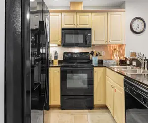 Inside, the fully stocked kitchen is a delight, featuring granite countertops, sleek black appliances, and an eat-in bar. Adjacent to the kitchen, the dining area comfortably seats four, making it perfect for intimate dinners or family meals.