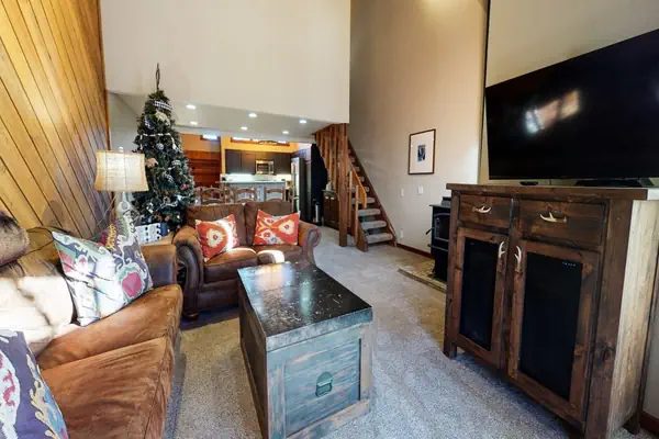 The second bedroom offers a California King bed and flatscreen TV, while the third features a Queen bed, flatscreen TV and access to the lower level balcony where you can step out on to the meadow and down to the creek.